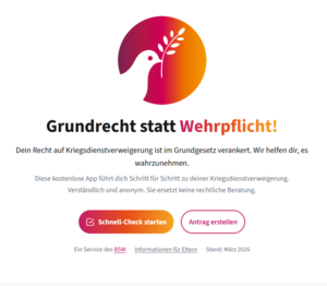 Grundrecht statt Wehrpflicht! Das seit Jahresbeginn geltende Wehrdienst-Modernisierungsgesetz verpflichtet alle 18-jährigen Männer zur Auskunft gegenüber der Bundeswehr; ab Juli kommenden Jahres sollen sie zudem zur Musterung erscheinen. Melden sich nicht genügend „Freiwillige“ für einen Dienst bei der Bundeswehr, kommt die Wehrpflicht. Unser neues Online-Tool hilft, vorsorglich den Wehrdienst zu verweigern. Unter www.grundrecht-kdv.de bieten wir eine Schritt-für-Schritt-Anleitung: Fragebogen richtig ausfüllen, Begründung schreiben, Dokument erstellen. 100 % kostenlos, verständlich und anonym.