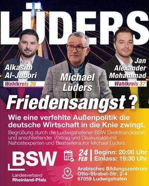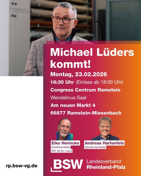 Der Bestsellerautor und stellvertretende Parteivorsitzende Michael Lüders kommt nach Rheinland-Pfalz. Er ist der Nahost-Experte schlechthin. Niemand sonst analysiert die außenpolitischen Zusammenhänge wie er. Und das in Ramstein, dem Dreh- und Angelpunkt der US-Kriegsmaschinerie in Europa.
