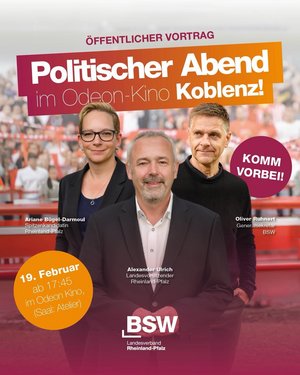 Auf geht's, am 19. Februar, ab 17:45 Uhr ins Odeon Kino (Saal: Atelier), Löhrstr. 88, 56068 Koblenz zum Politischen Abend!